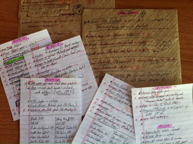 Plan your day everyday, and never deviate I plan out each day the night before on small sheets of paper or an occasional napkin from my neighborhood café. Once I get up the next morning, and after I stretch, work out, eat breakfast, and shower, I turn on my computer and start red penning each item on the day’s “To Do” list. If I get to the bottom and they’re not all Xed out, guilt sets in. But if I do (and I always do), I’m free to enjoy whatever else I want to do with the remainder of my day. Notes like this can keep us organized enough to get through the things we need to do so we can do some of the things we want to do. (More on needs and wants shortly.)