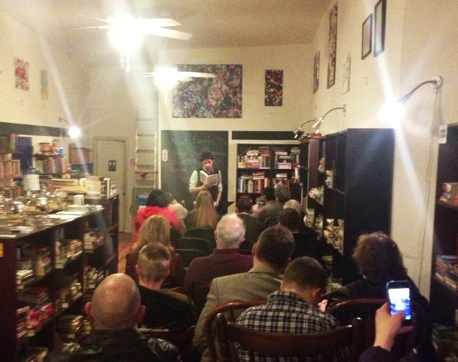 Amid a packed audience captivated by my personal stories of how Crowdfunding for Filmmakers came about and the various chapters I chose to read from, the evening was made even more significant simply because it was hosted by Tachair Bookshoppe. See, back in April, 2012, I wrote an article about Jersey City’s lack of a physical bookstore for Jersey City Independent. At that point in time, Tachair was a “roving” bookstore that would set up their tent at all the different markets and festivals in Downtown Jersey City. But partly because of my article and the spirited reception it received online, Aleta Valleau, her son Paul, and her mother Carol set up shop on Newark Avenue where they now sell used books, best-sellers, and books by local authors like me (and I hear those sell better than those best-sellers!)